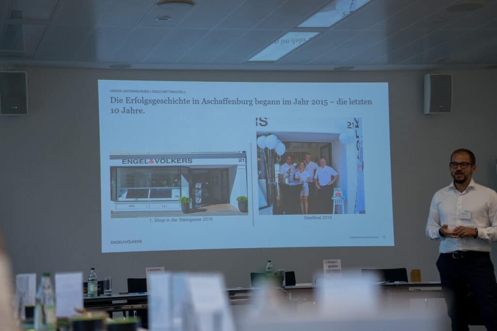 In einem zehnminütigen Vortrag gab Dr. Björn Ahner von Engel & Völkers Immobilien Aschaffenburg einen kompakten Einblick in die Entstehung und Geschichte von Engel & Völkers. Er skizzierte die Anfänge des Unternehmens und zeigte auf, wie sich die Marke über die Jahre zu einem international erfolgreichen Immobilienunternehmen entwickelt hat.